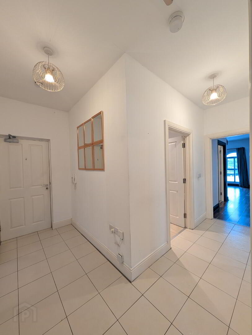 With stainless steel sink unit, range of eye and low level units, concealed lighting, saucepan drawers, Indesit hob and under-oven, extractor, integrated dishwasher, fridge freezer and washer dryer, recessed lights tiled splashback and floor.