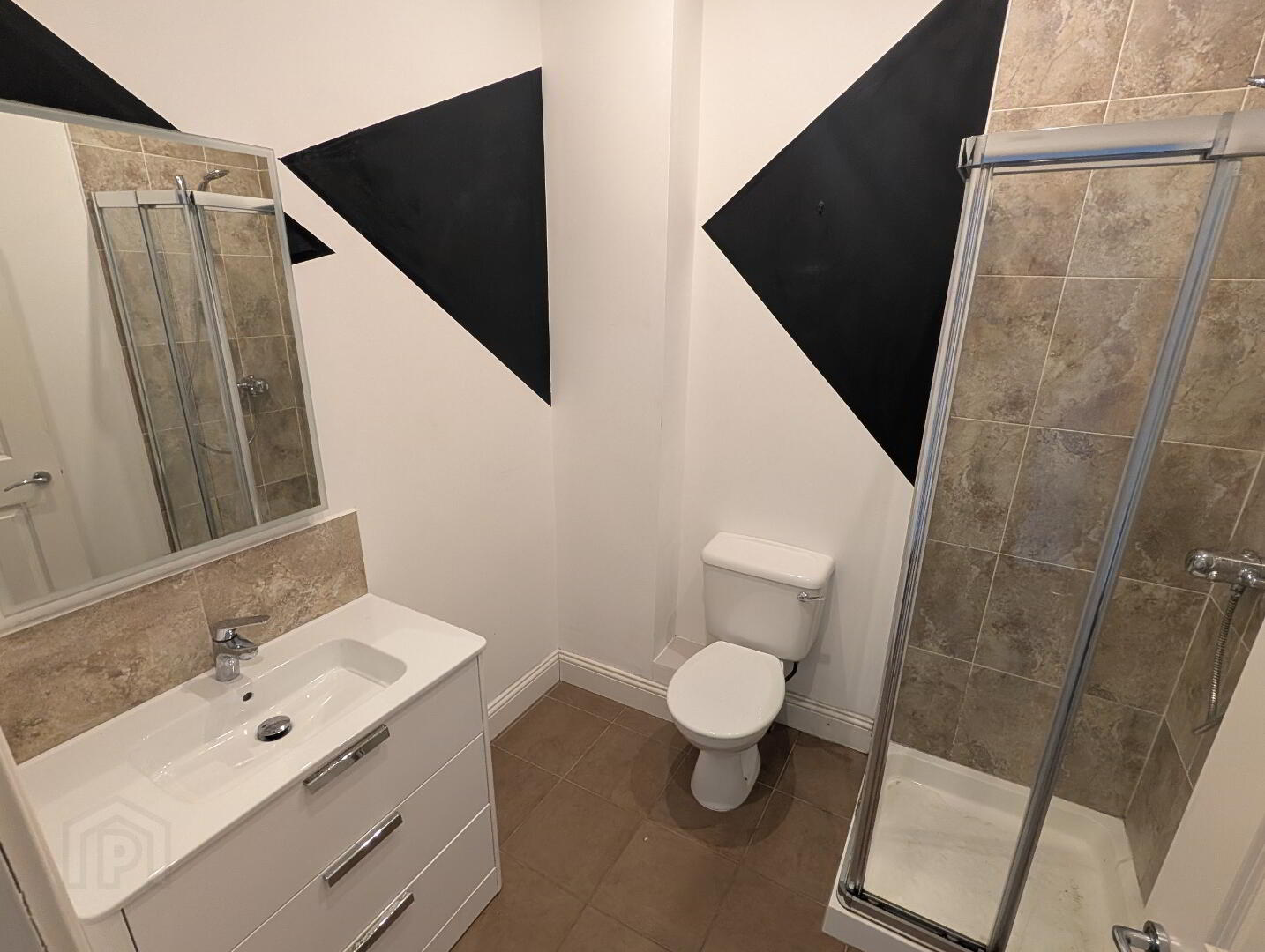 Ensuite 6’9 x 6’7 comprising WC, vanity unit, tiled walk-in shower cubicle, Sirrus mains shower fitting, extractor, recessed lights, tiled splashback and floor