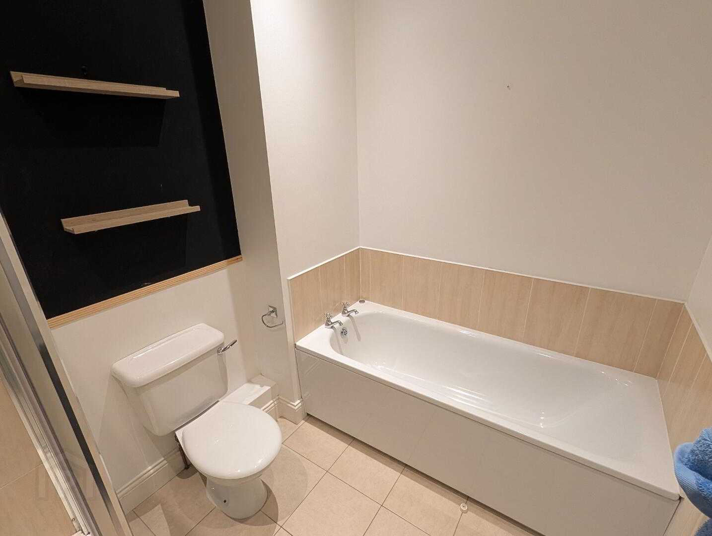 with vanity unit, tiled walk-in shower cubicle, mains shower fitting, extractor fan recessed lights, part tiled around Bath and vanity unit, tiled floor