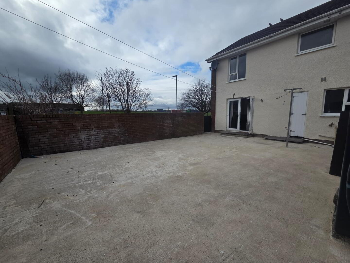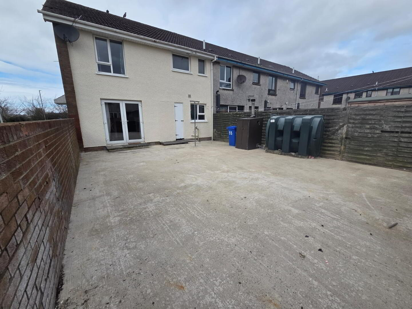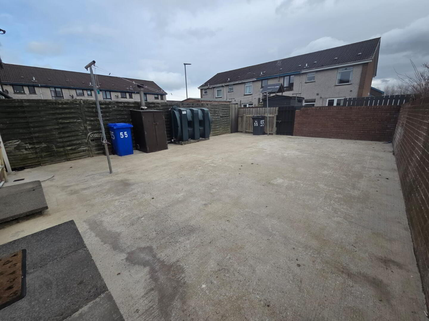 Wall and fence enclosed concrete garden area to rear