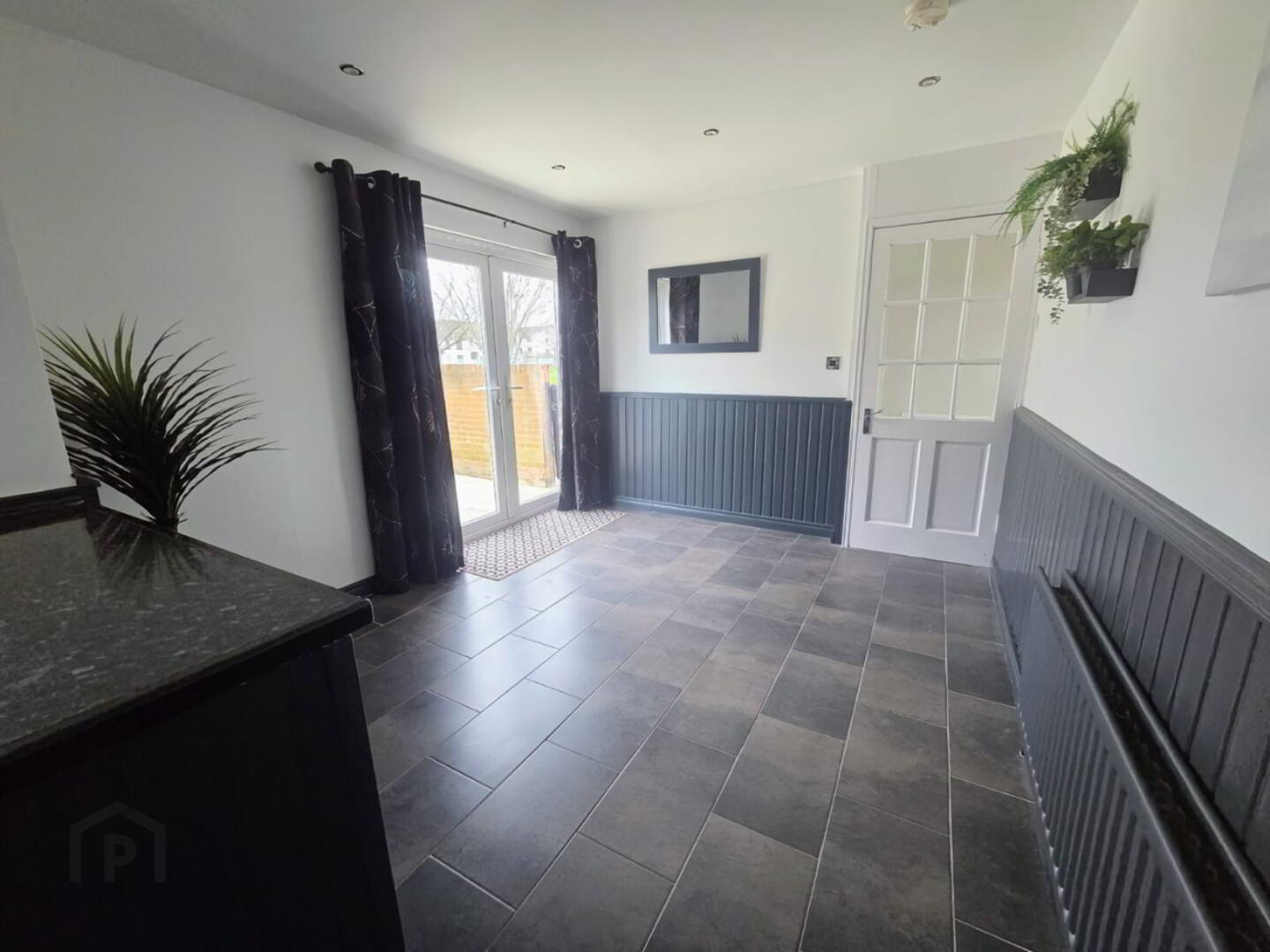 with ½ panelled walls, recessed lights, tiled floor, French doors to rear garden, glass panel door to hall.