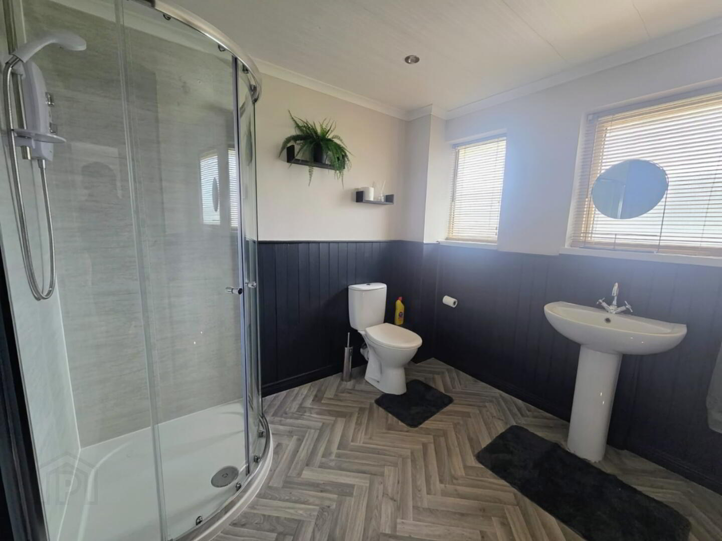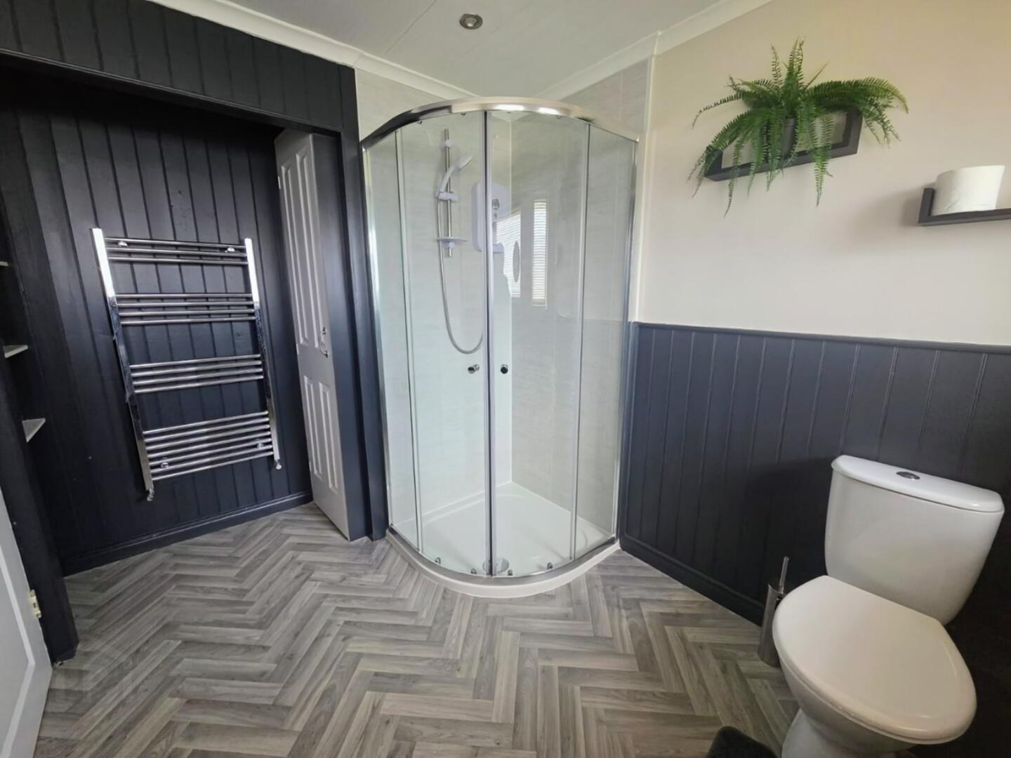 Withtlephone hand shower,  uPVC panelled walk in shower cubicle, ‘RedRing glow’ shower, ½ panelled walls and sheeted ceiling. Recessed area with shelving