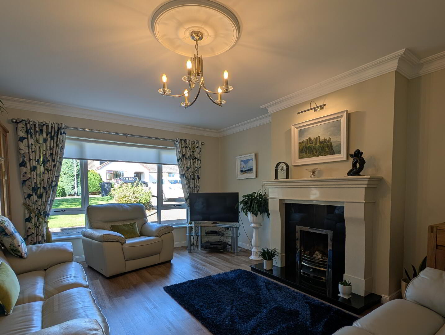 with feature marble surround fireplace, granite inset and hearth, points for wall lights, coving and centrepiece, Karndene flooring