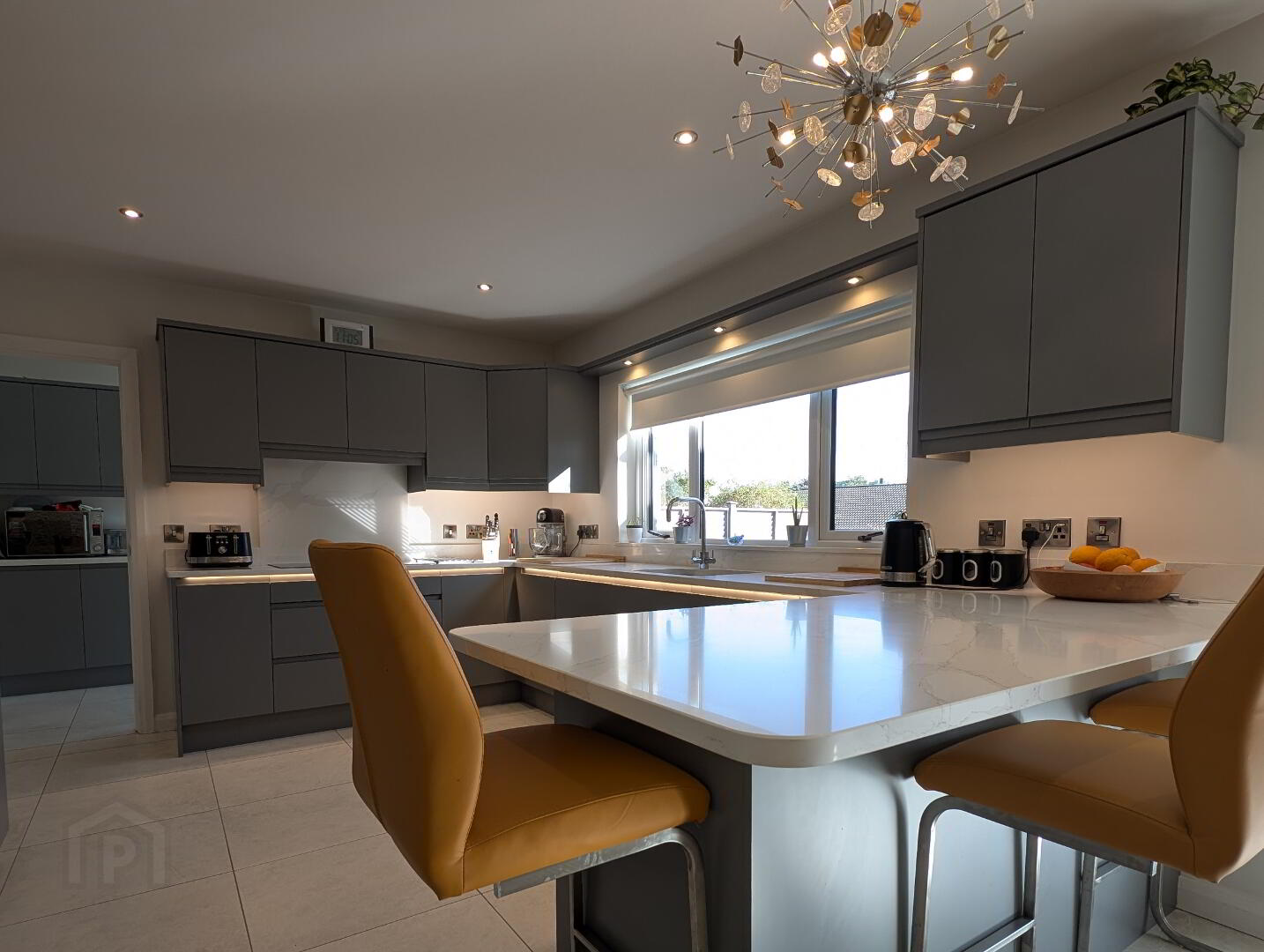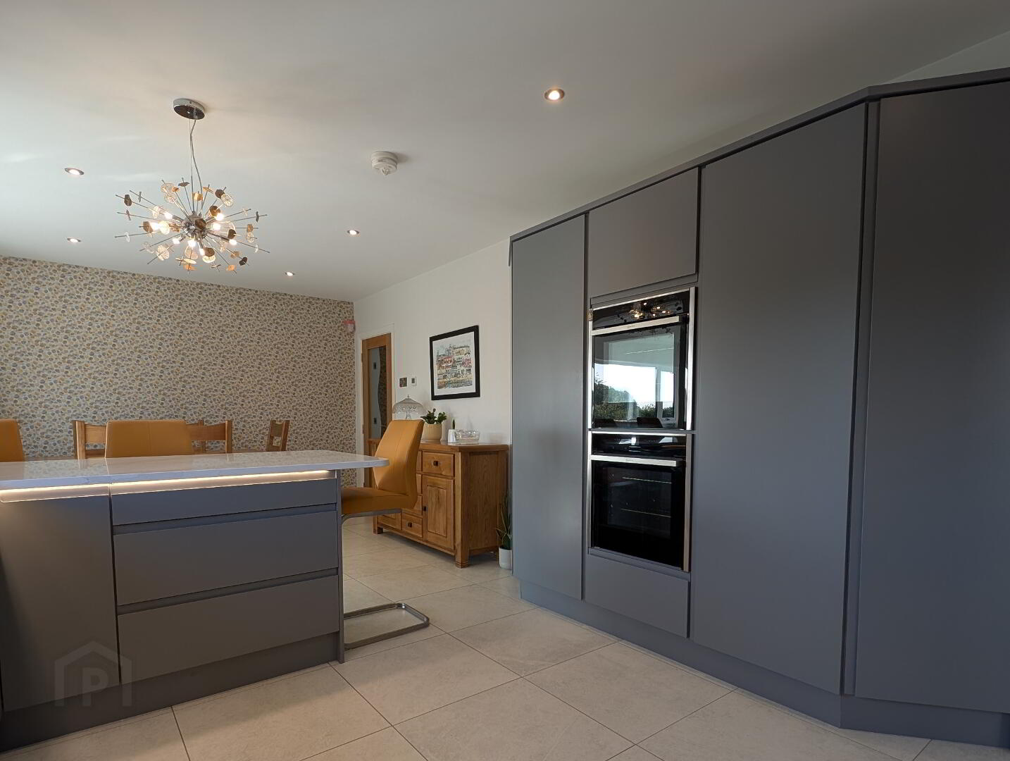 with Franke bowl and half stainless steel sink unit, range of eye and low level units, concealed lighting, pull-out bin, storage/larder unit, saucepan drawers, pelmet with downlighters, Quartz work top, upstand and splashback, AEG induction hob, twin Neff single ovens, extractor, integrated larder style fridge and dishwasher, recessed lights and tiled floor. Open Plan to: