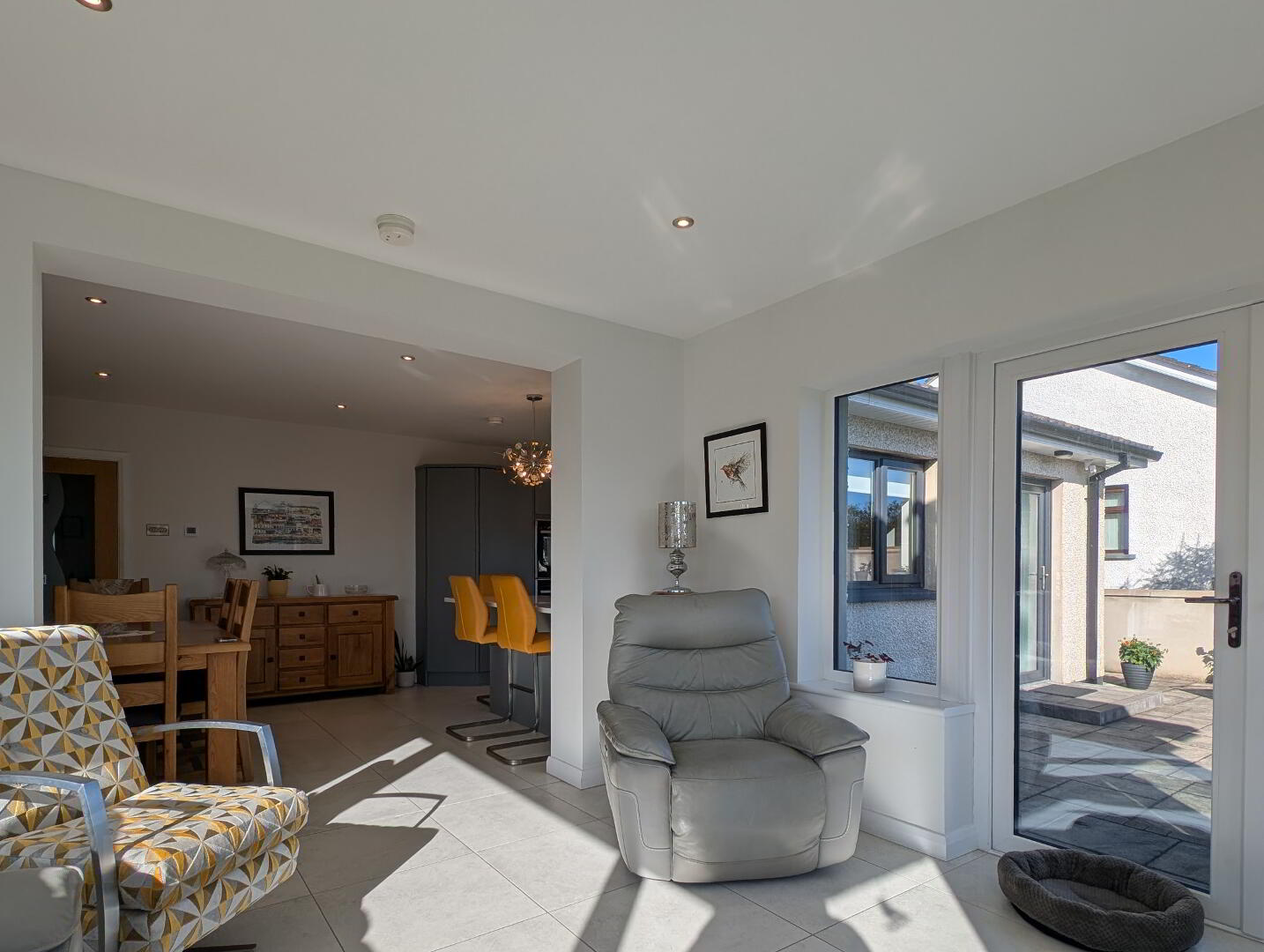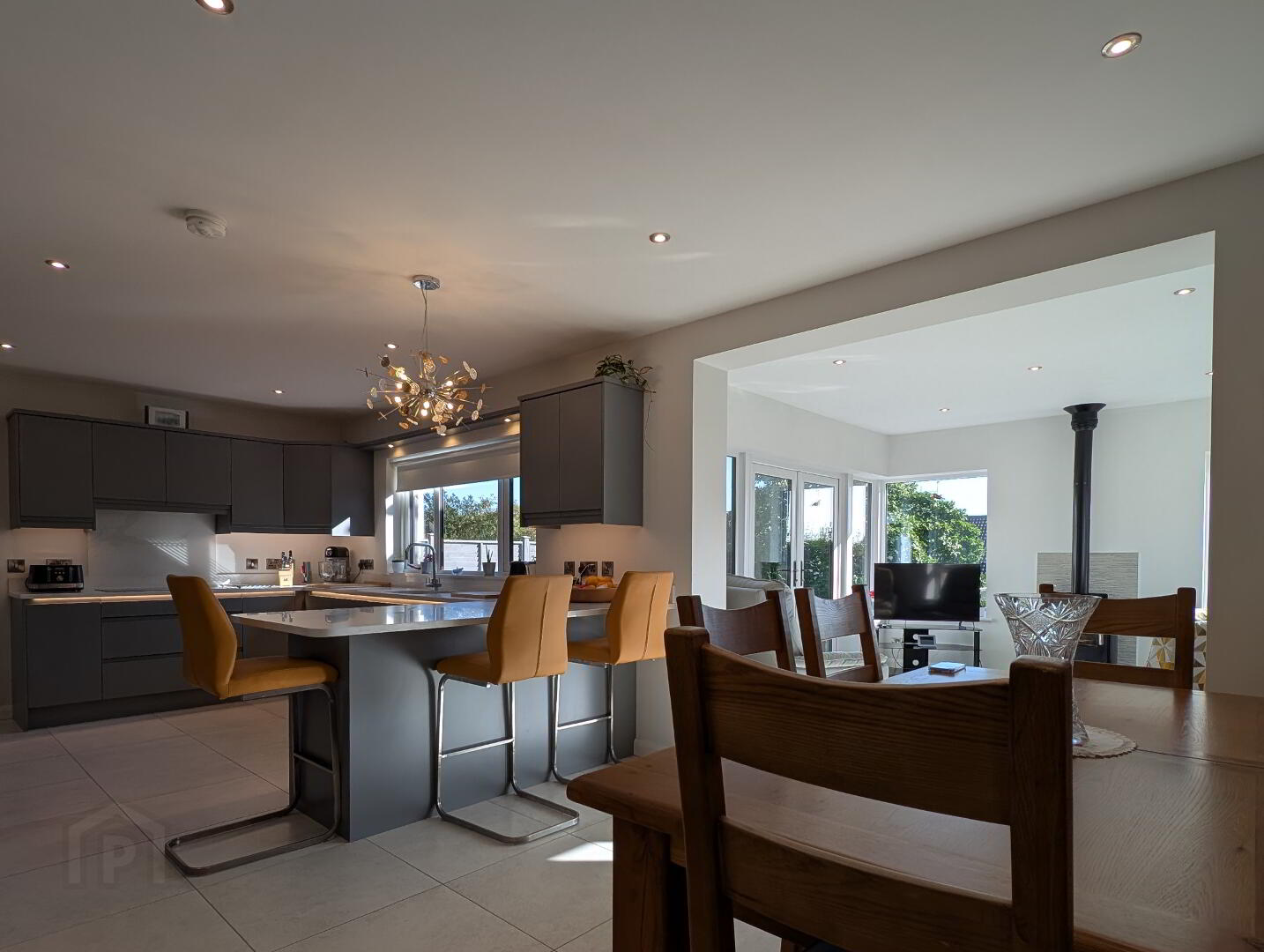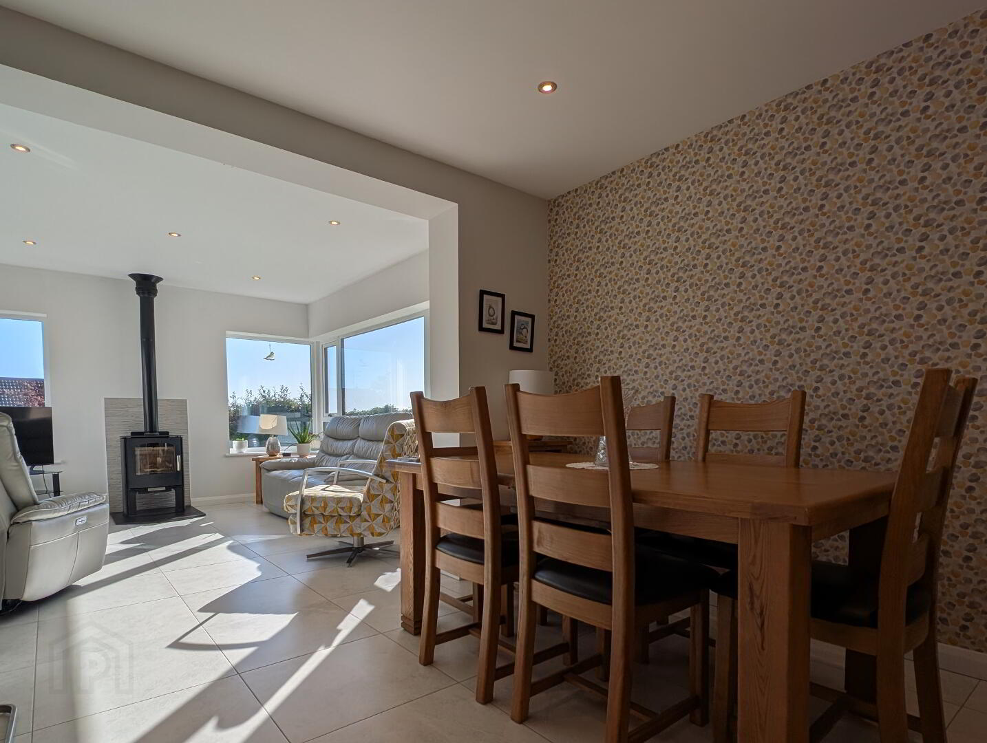 with multi-fuel stove on slate hearth, recessed lights, tiled floor, double French doors to patio area.