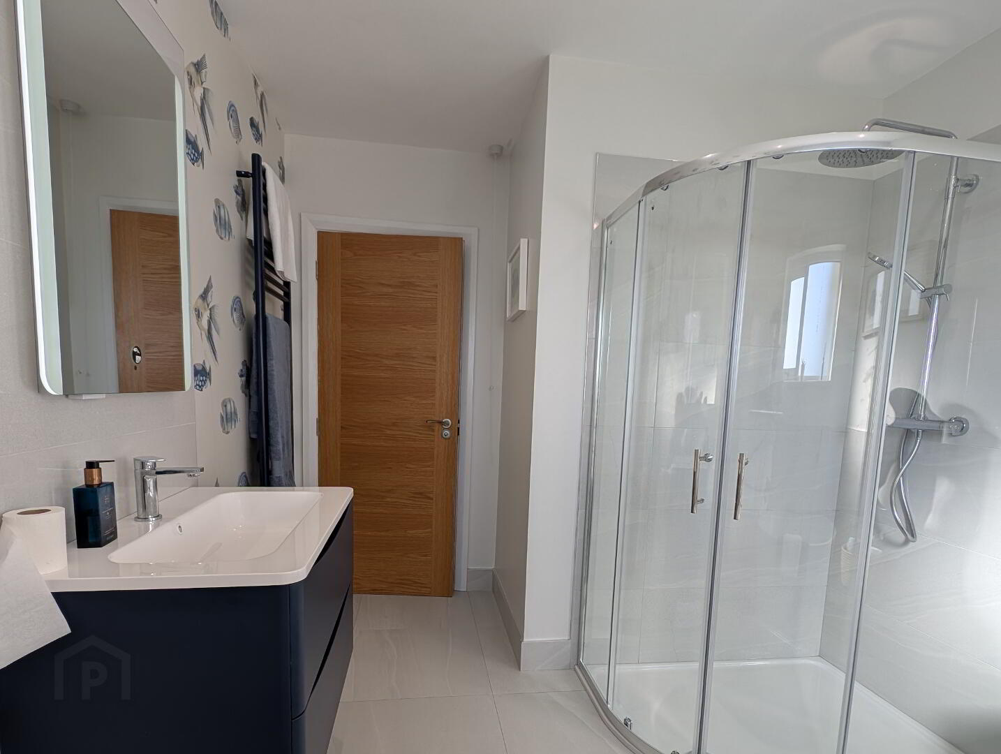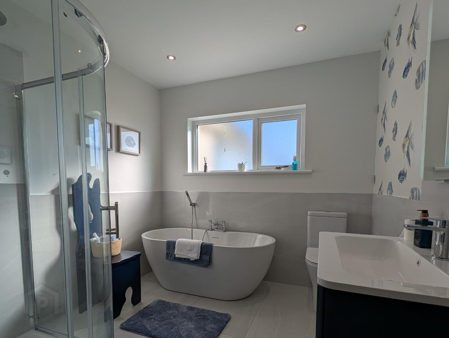 with free standing bath, “floating” double wah hand basin, corner tiled walk-in shower cubicle mains shower fitting with telephone hand and raindrop shower heads, extractor, recessed lights, half tiled walls and tiled floor