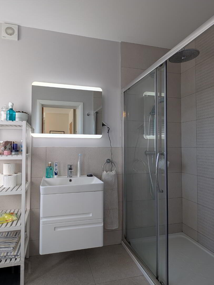 Ensuite comprising WC, “floating” wash hand basin, double tiled walk-in shower cubicle, mains shower fitting with telephone hand and raindrop shower heads, extractor, recessed lights, half tiled walls and tiled floor