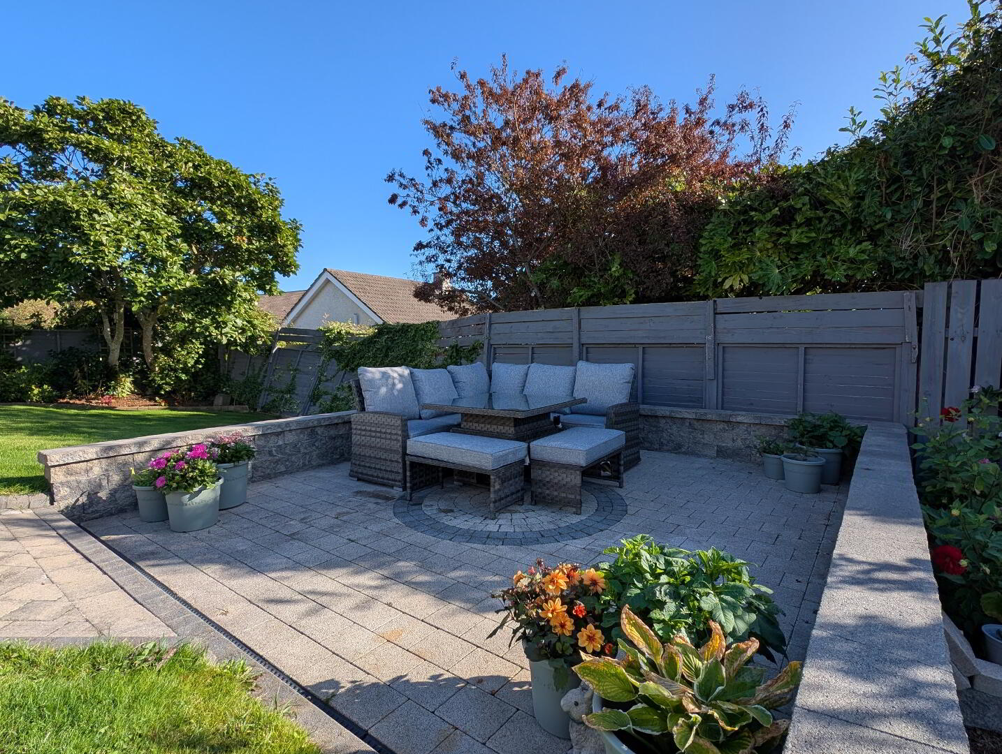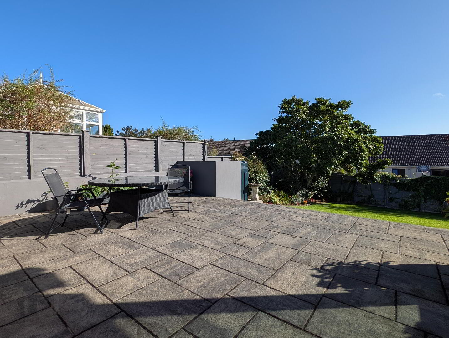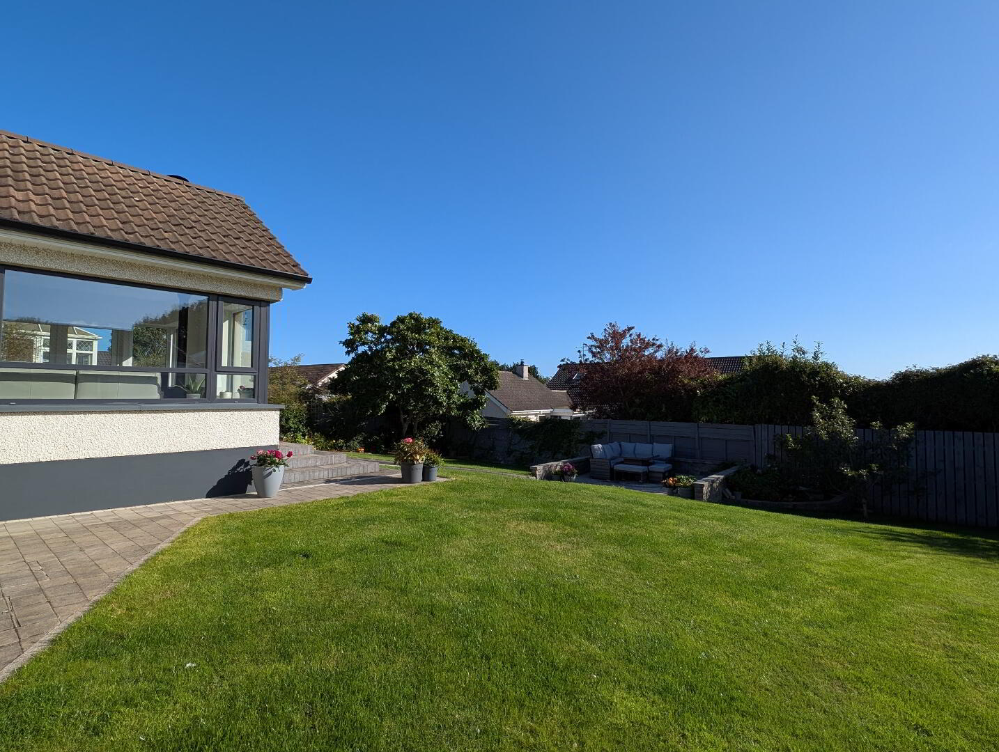 Generous wall and fence enclosed garden to rear with paved patio area on the upper level and steps down to the lower which is laid in lawn with mature shrub borders and paved BBQ area