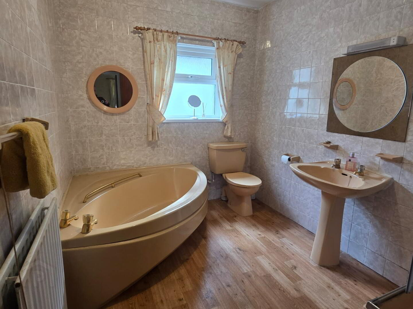 with coloured suite, corner bath, gold plated fittings, tiled walk-in shower cubicle, RedRing Bright shower fitting, shaver light and tiled walls