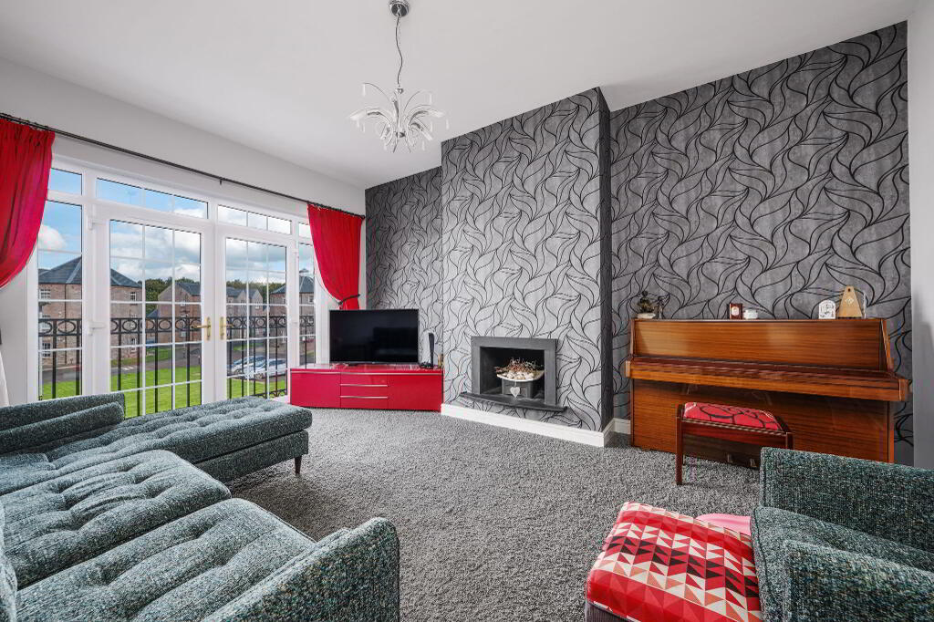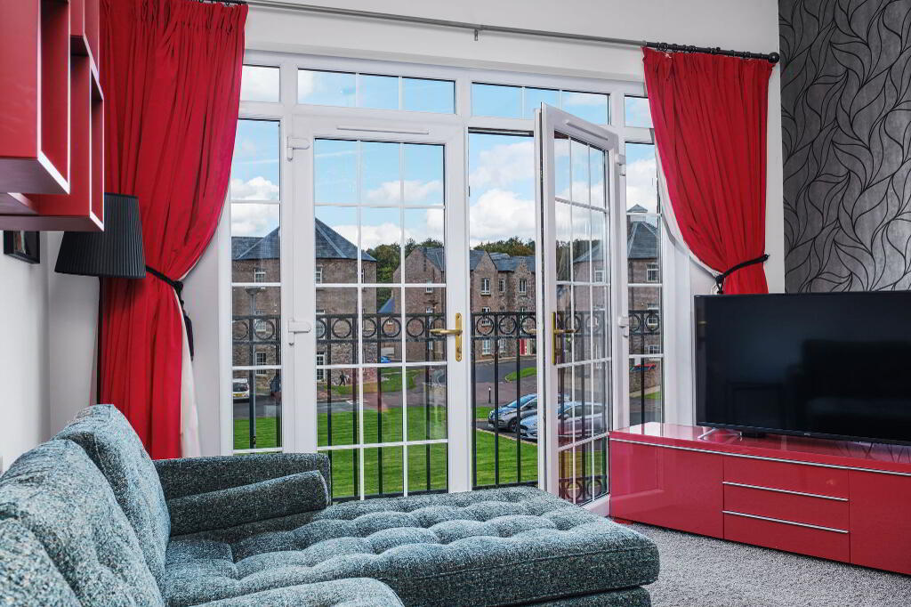 with feature slate bound raised fireplace, slate tiled hearth, “Juliette” style balcony doors