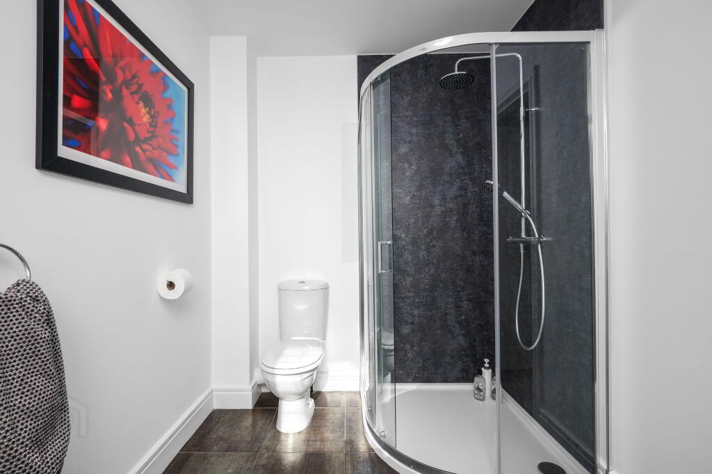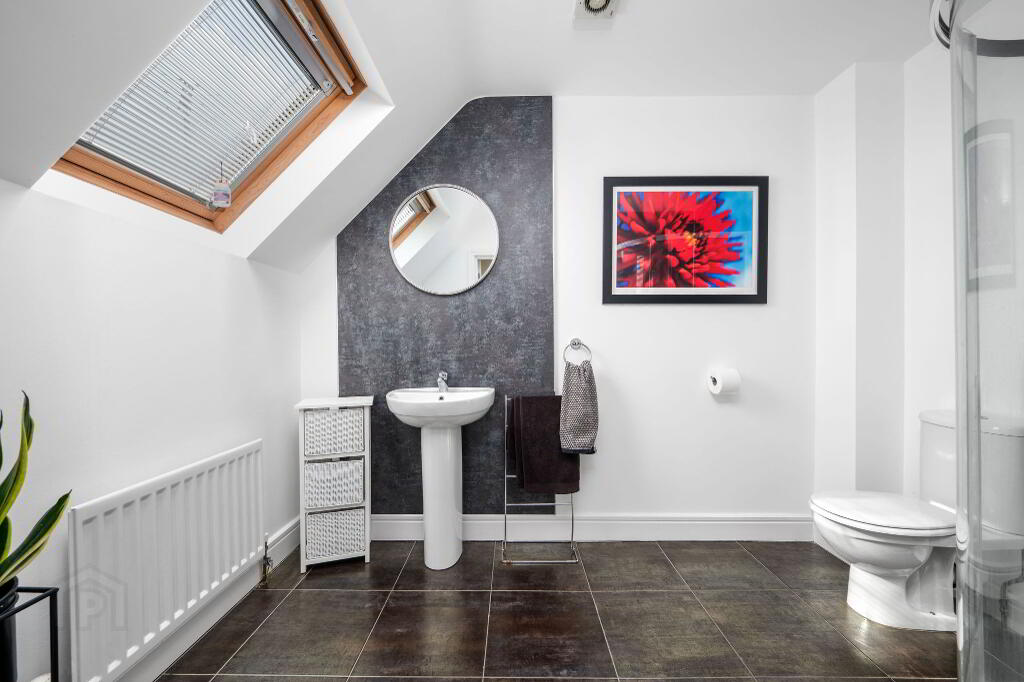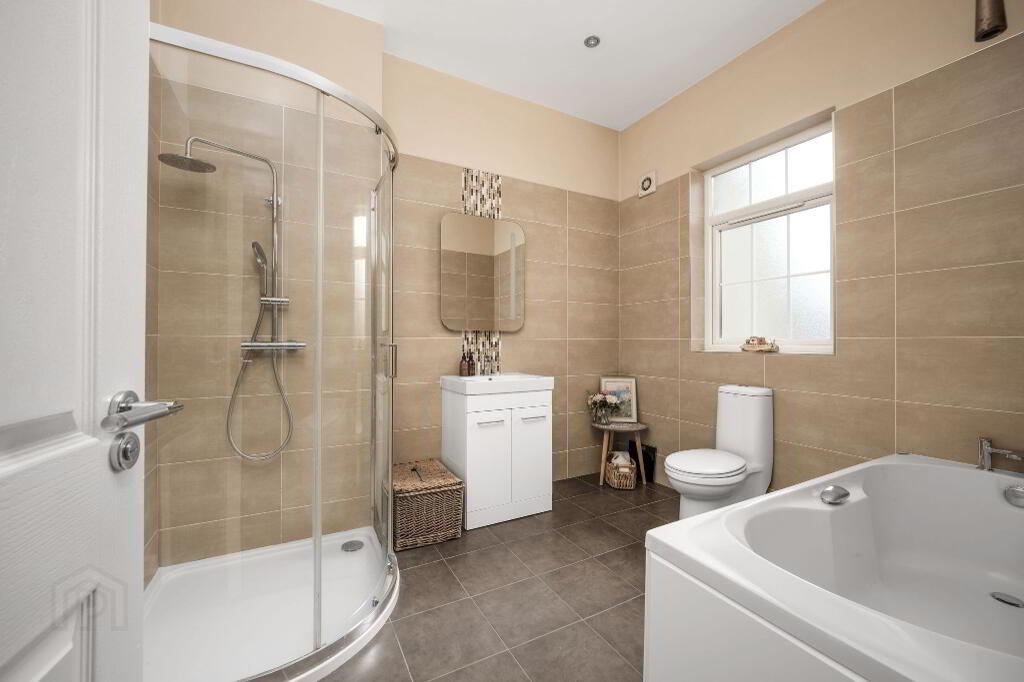 Ensuite comprising WC, wash hand basin, uPVC panelled walk-in shower cubicle, Mira shower fitting, extractor, tiled floor