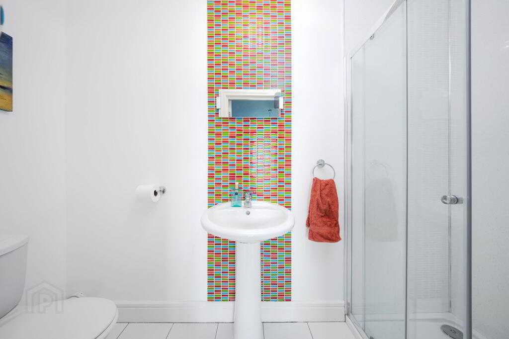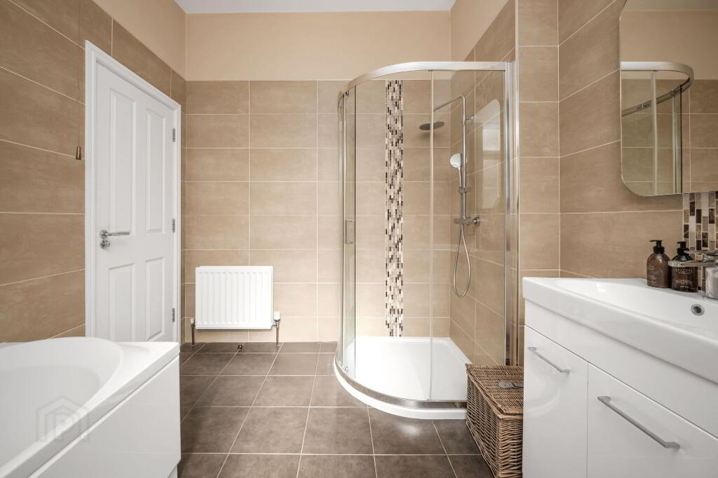 with vanity unit, tiled walk-in shower cubicle, mains shower fitting, telephone hand and raindrop shower heads, extractor, recessed lights, 2/3 tiled walls and tiled floor