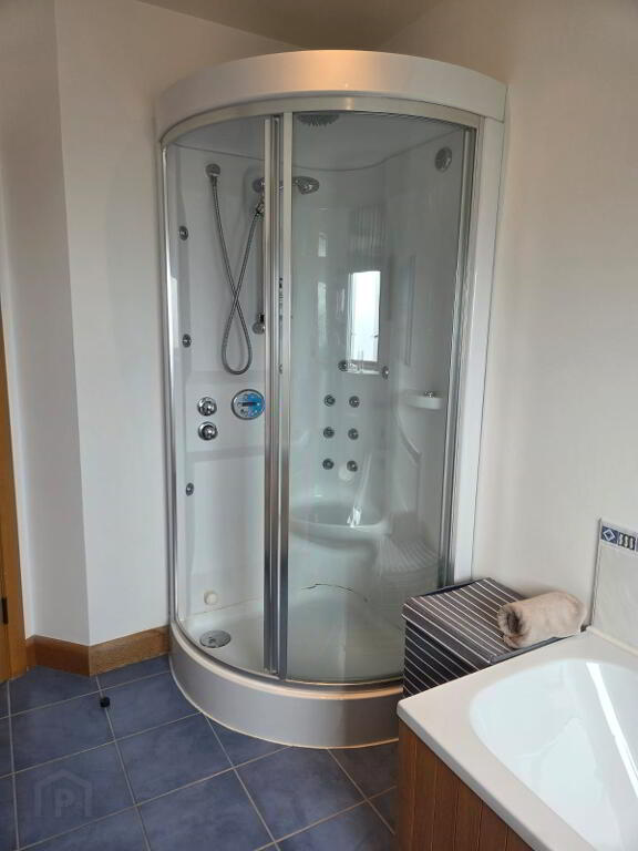 With vanity unit, enclosed walk-in jet shower cubicle, extractor, recessed lights, part tiled around bath and wash hand basin, tiled floor