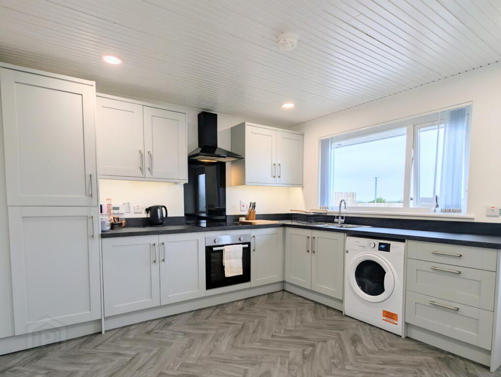 with bowl and half stainless steel sink, range of eye and low level units, Beko hob and under oven, extractor, glass splashback, integrated fridge-freezer, plumbed for automatic washing machine, recessed lights and sheeted ceiling