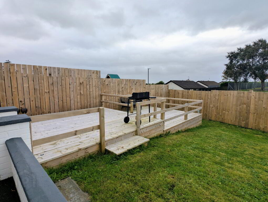 Fence enclosed garden in lawn to rear with two tiered decked area