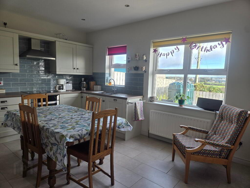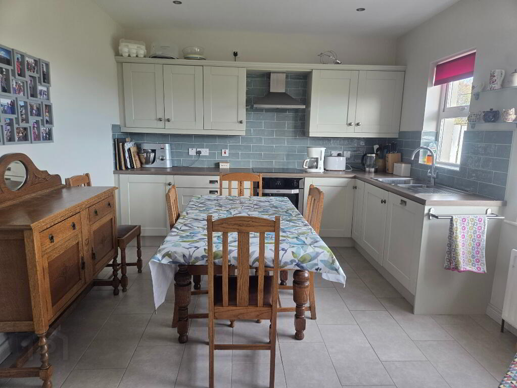 with stainless steel sink unit, Shaker style eye and low level units, plumbed for automatic washing machine, tiled between work tops and eye level units, tiled floor