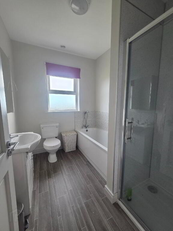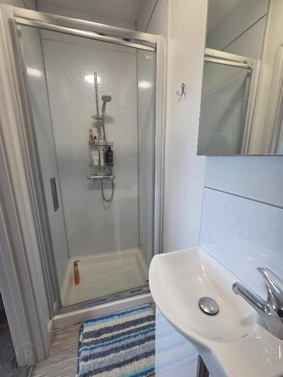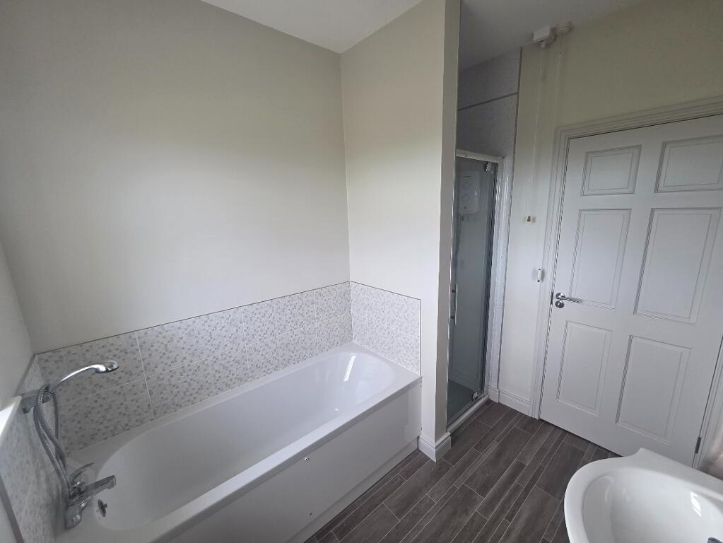 Ensuite comprising WC, vanity unit, uPVC panelled walk-in shower cubicle, mains shower fitting, extractor, tiled splashback