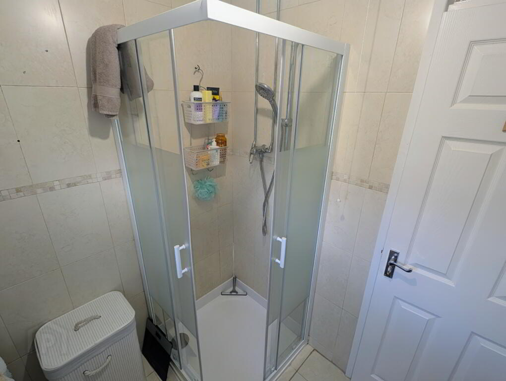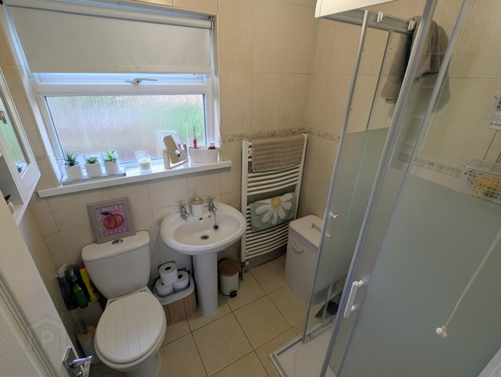 with WC, wash hand basin, tiled walk-in shower cubicle, mains shower fitting, panelled ceiling tiled walls and tiled floor