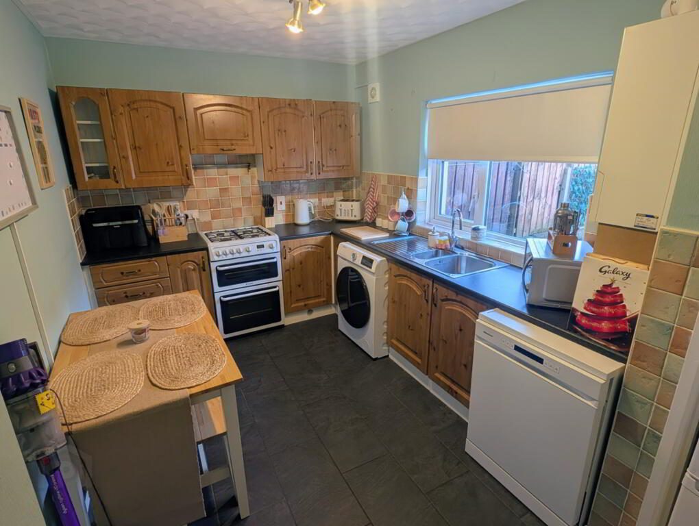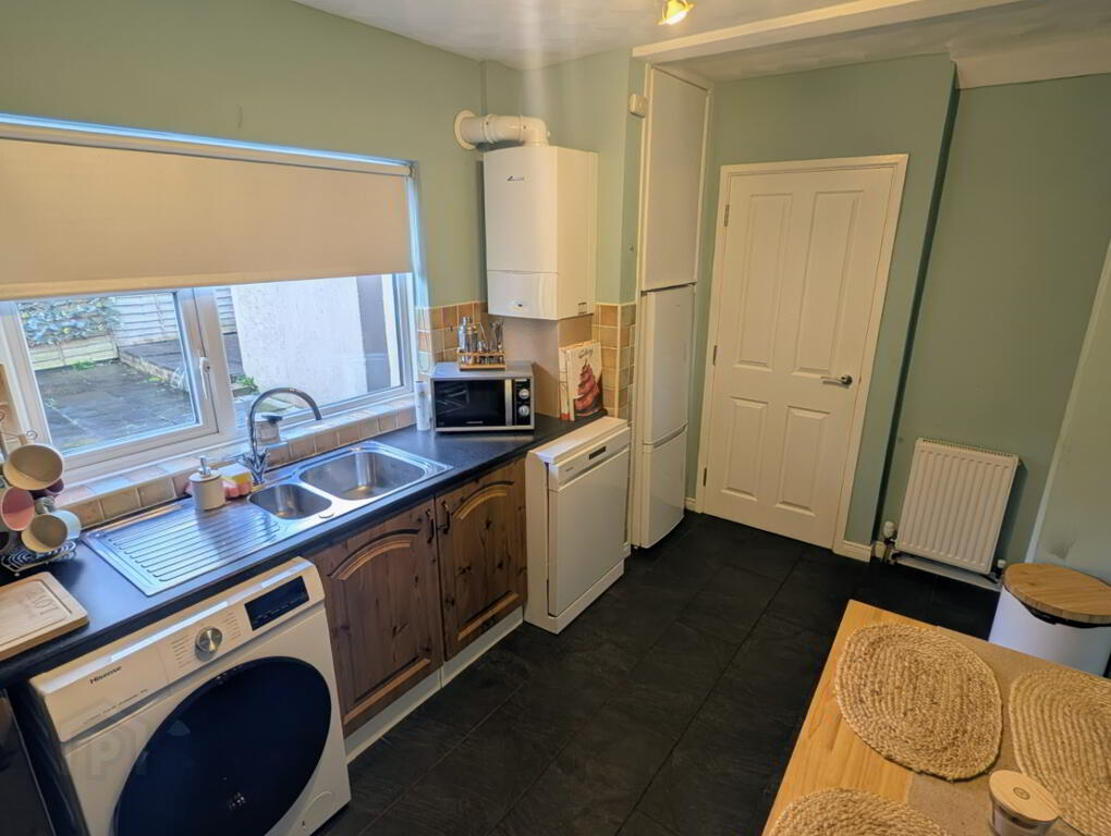 with bowl and half stainless steel sink unit, range of eye and low level units, display cabinet, concealed lighting, plumbed for automatic washing machine and dishwasher, tiled between work tops and eye level units, tiled floor