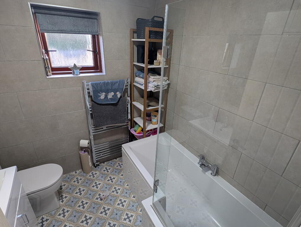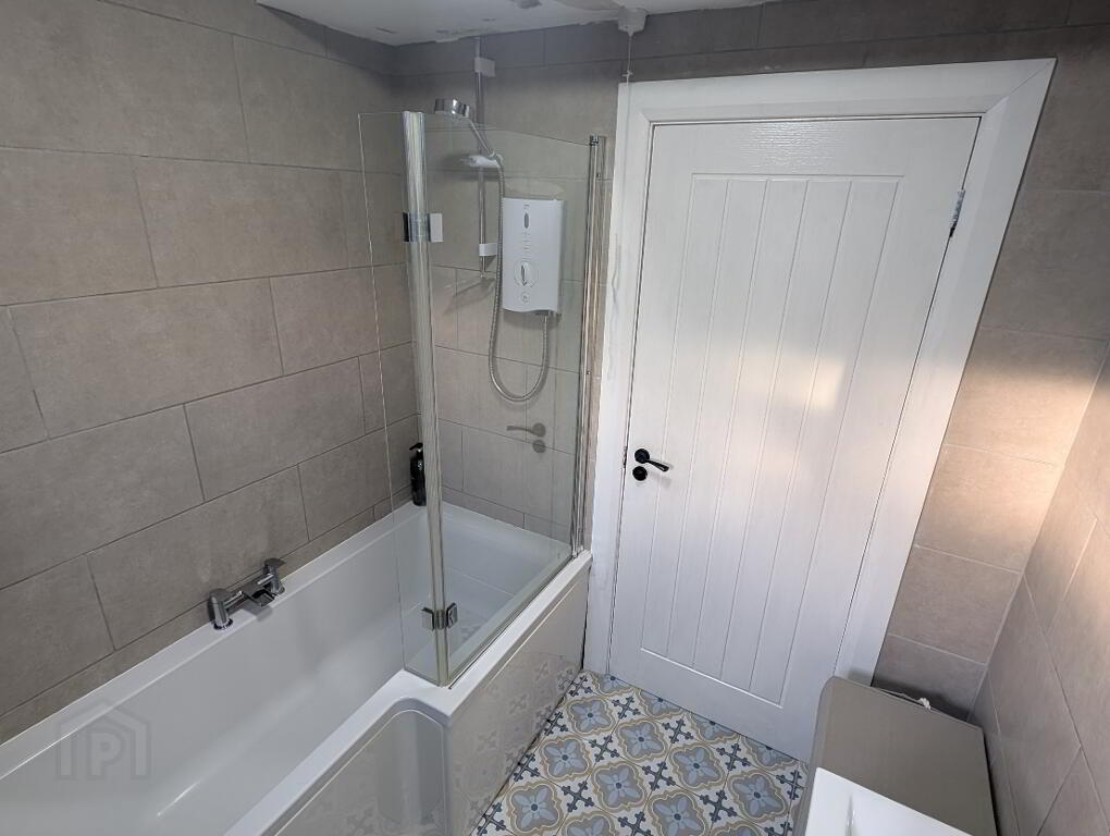 with P-Shaped bath, vanity unit, Mira Sport shower over bath, extractor, tiled walls and floor Hot Press