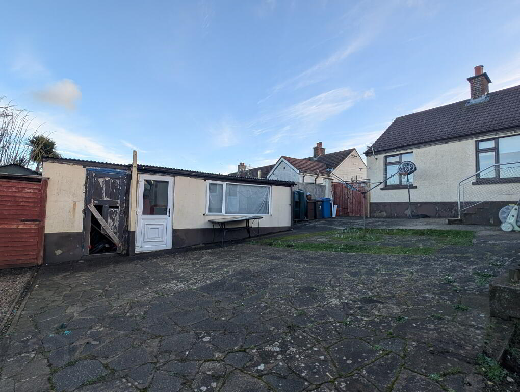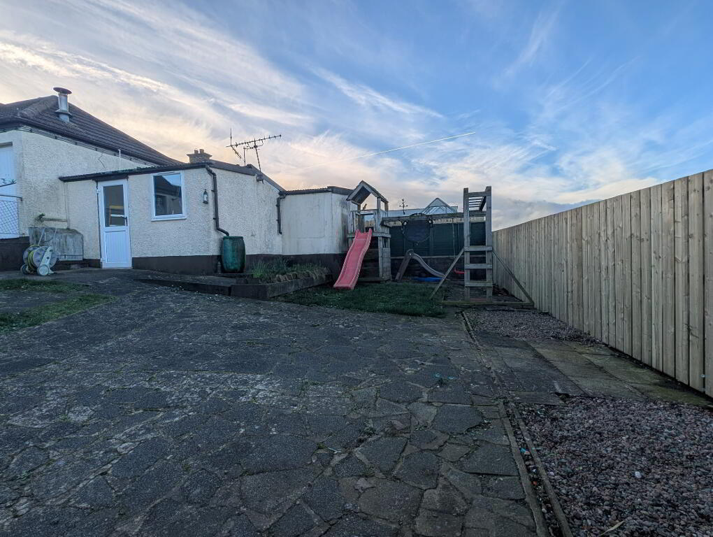 Garden in lawn to front with crazy paved and tarmac area. Wall and Fence enclosed garden to rear part in lawn with concrete and crazy paved patio/BBQ areas. Outside Lights and Tap. Tarmac Driveway