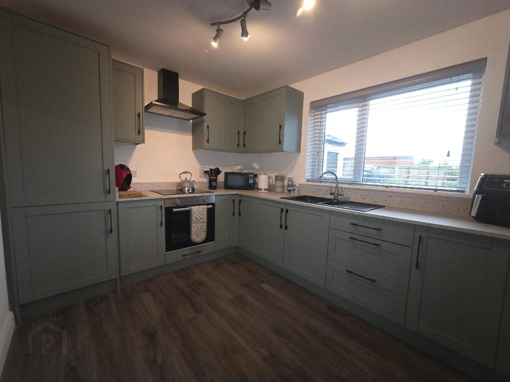 with bowl and half sink unit, range of Shaker style eye and low level units, Beko hob and under-oven, extractor fan, integrated fridge-freezer, laminated wooden flooring