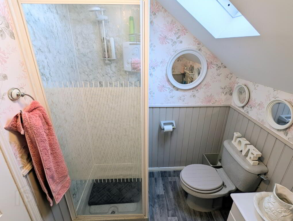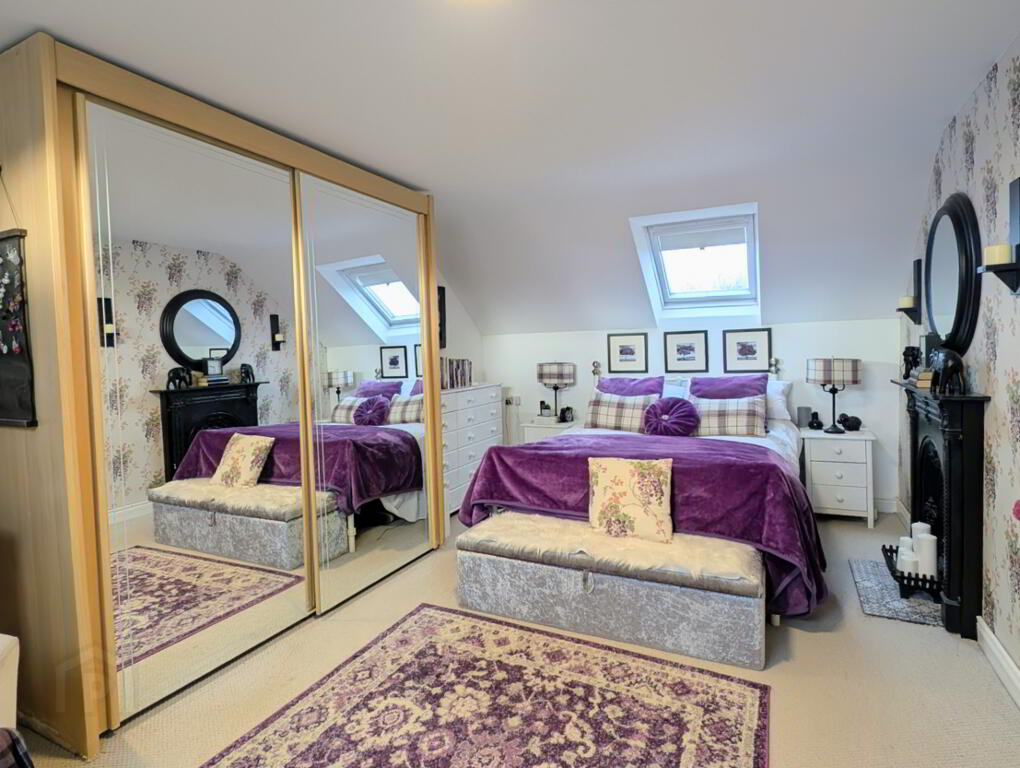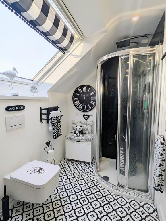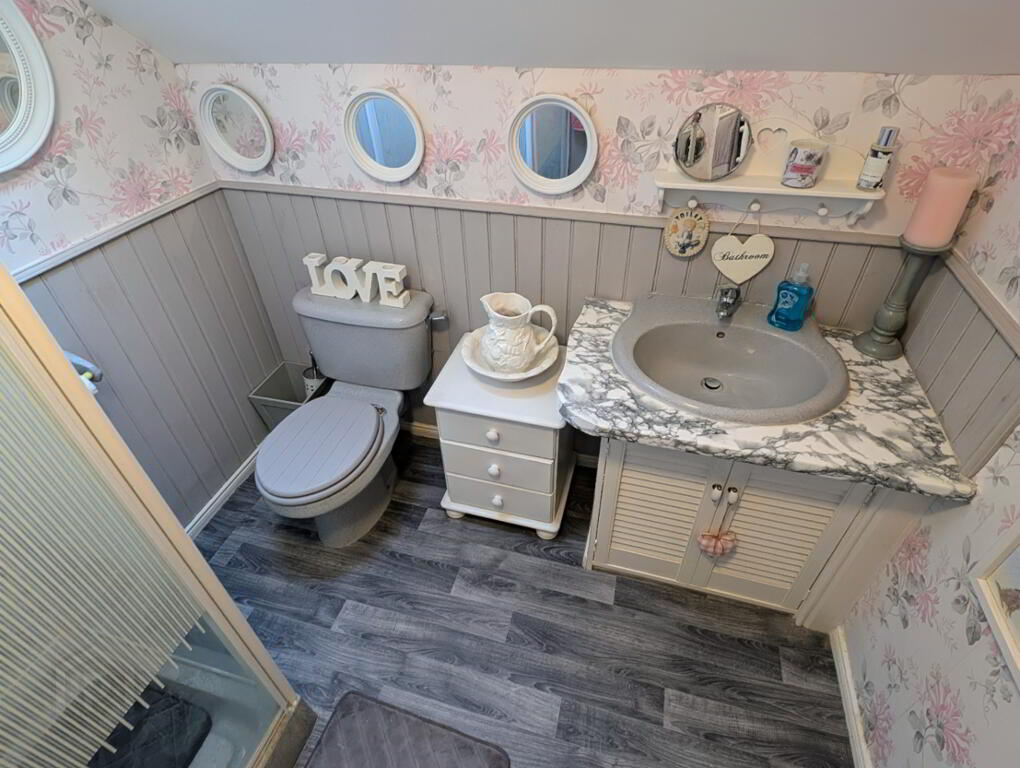 Ensuite comprising WC, vanity unit, uPVC panelled walk-in shower cubicle, Mira shower fitting, with telephone hand and raindrop shower heads, extractor and recessed lights
