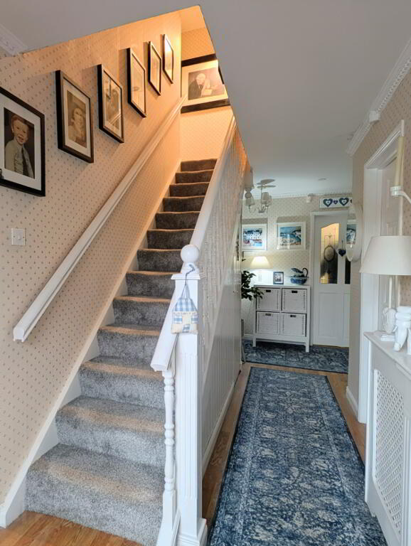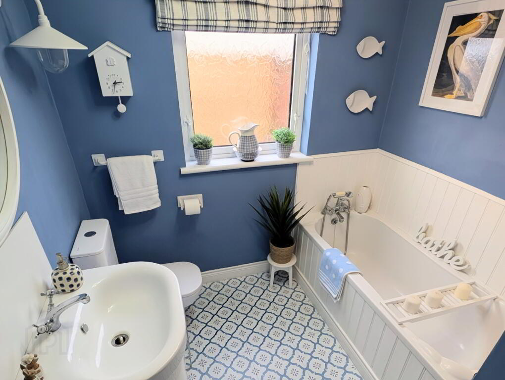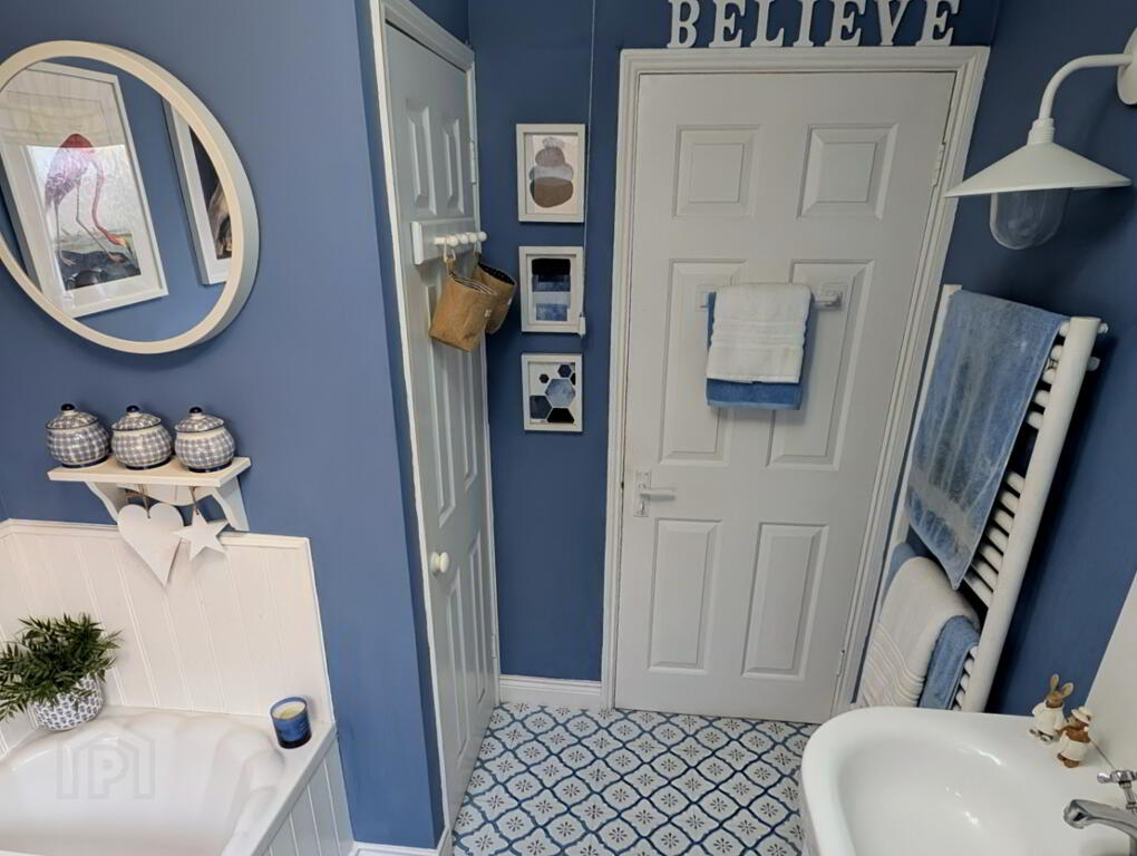 with vanity unit, telephone hand shower, extractor, part panelled walls, points for wall lights, coving, laminated wooden flooring