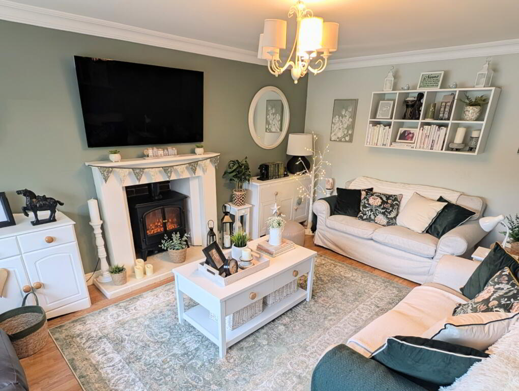 with feature wooden surround fireplace, tiled heart, coving and laminated wooden flooring