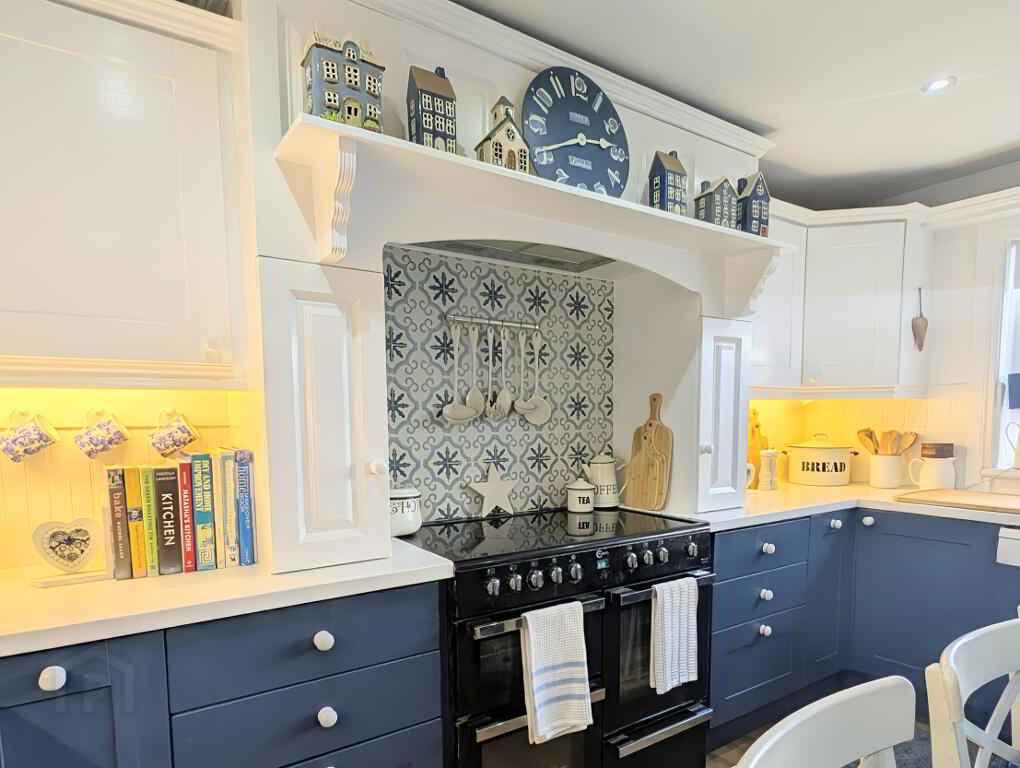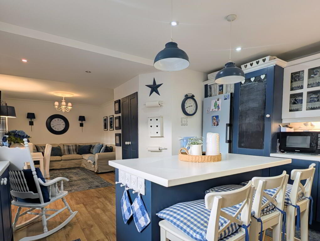 with bowl and half stainless steel sink unit, range of eye and low level units, pelmet with down-lighters, display cabinets, plate rack, storage cupboard/Pantry, concealed lighting, space for range style cooker, extractor, plumbed for dishwasher, tiled splashback, recessed lights. Double doors and glass panel door to: