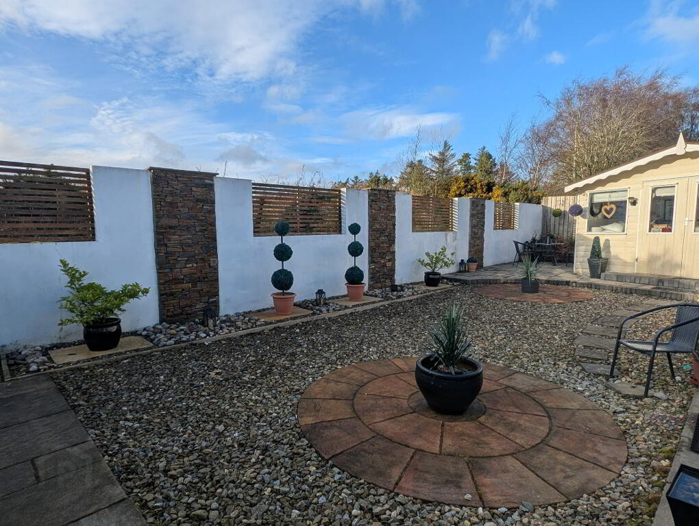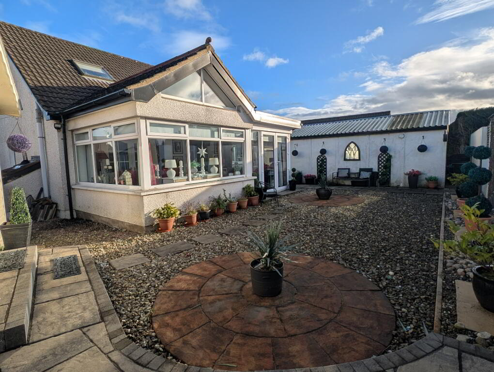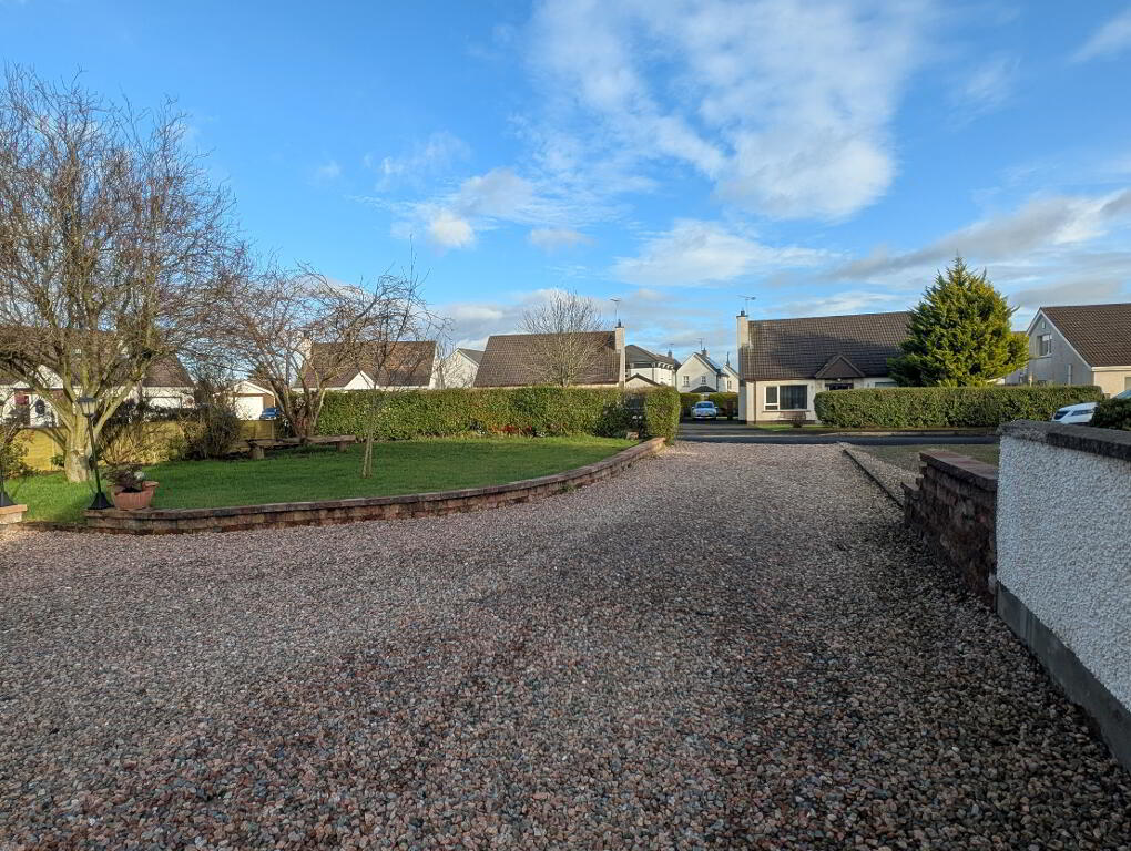 Coloured stone driveway and parking area. Additional concrete parking bay.