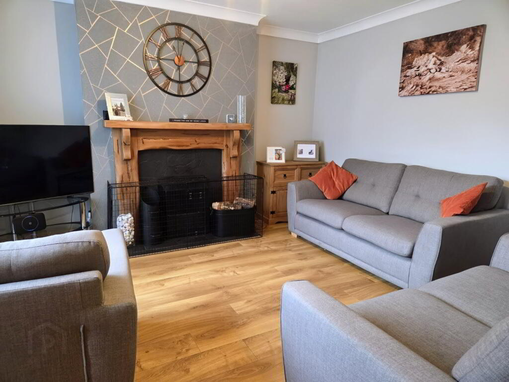 with feature “Driftwood” surround fireplace, slate tiled inset and hearth, back boiler coving, dimmer switch and laminated wooden flooring
