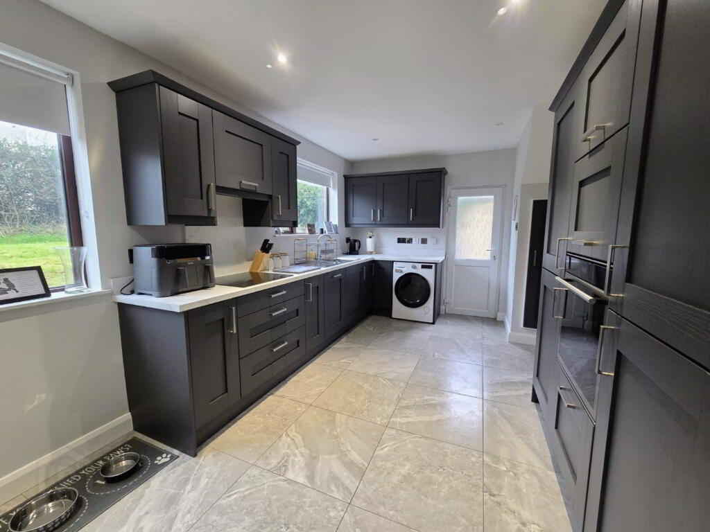with bowl and half stainless steel sink unit, range of Shaker style eye and low level units, larder unit, saucepan drawers, microwave housing, Hotpoint hob and oven, extractor, integrated dishwasher and fridge-freezer. plumbed for automatic washing machine, TV point and recessed lights, tiled floor