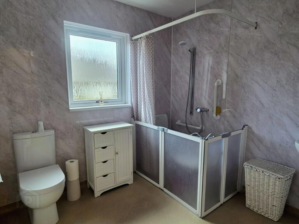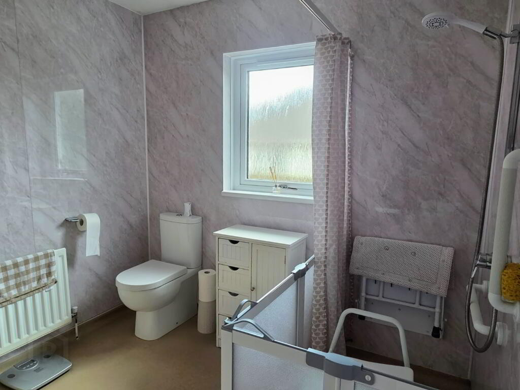 with WC, wash hand basin uPVC panelled shower area, Bristan mains shower fitting, extractor, uPVC panelled walls