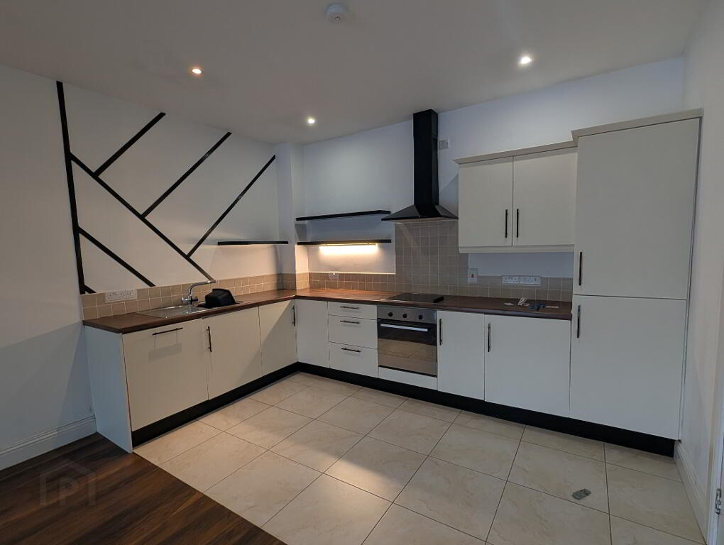 With stainless steel sink unit, range of eye and low level units, concealed lighting, saucepan drawers, Indesit hob and under-oven, extractor, integrated dishwasher, fridge freezer and washer dryer, recessed lights tiled splashback and floor.