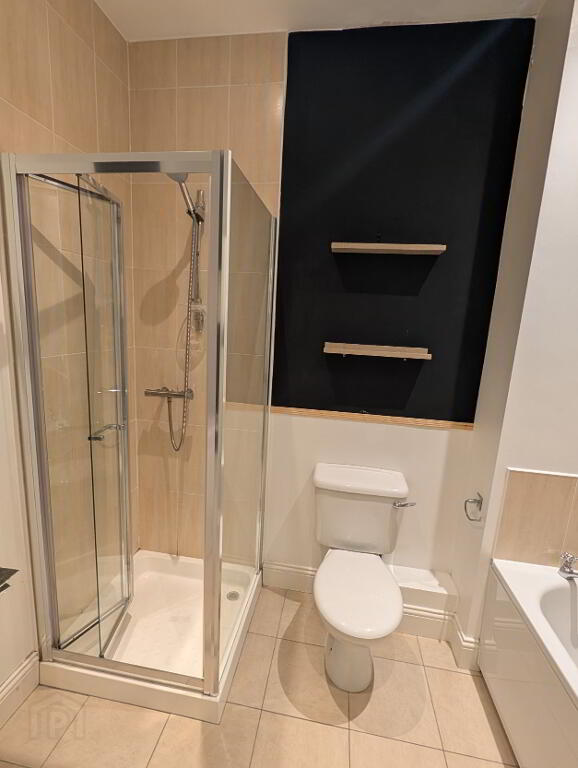 with vanity unit, tiled walk-in shower cubicle, mains shower fitting, extractor fan recessed lights, part tiled around Bath and vanity unit, tiled floor