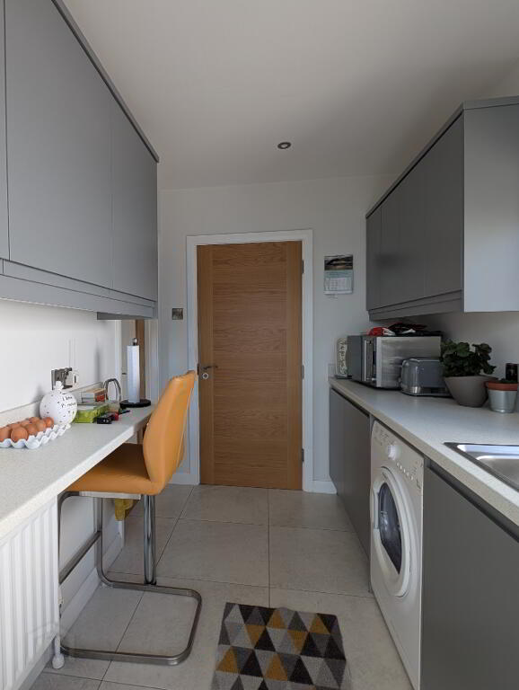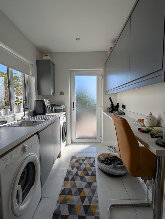 with stainless steel sink unit, eye and low level units, plumbed for automatic washing machine, vented for tumble dryer, tiled floor and recessed lights
