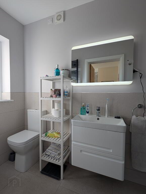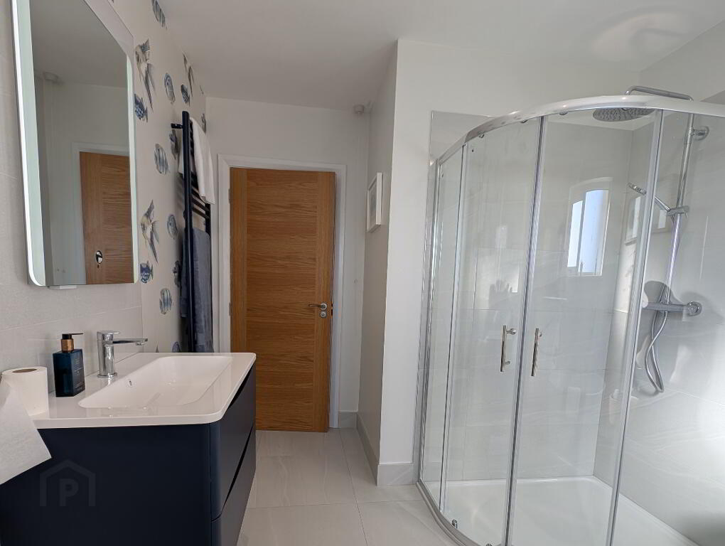 Ensuite comprising WC, “floating” wash hand basin, double tiled walk-in shower cubicle, mains shower fitting with telephone hand and raindrop shower heads, extractor, recessed lights, half tiled walls and tiled floor