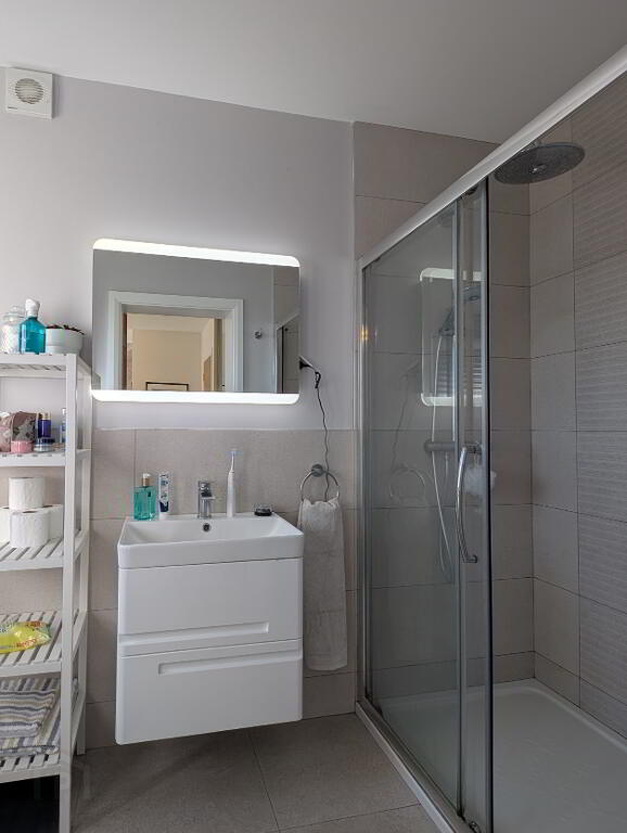 with free standing bath, “floating” double wah hand basin, corner tiled walk-in shower cubicle mains shower fitting with telephone hand and raindrop shower heads, extractor, recessed lights, half tiled walls and tiled floor