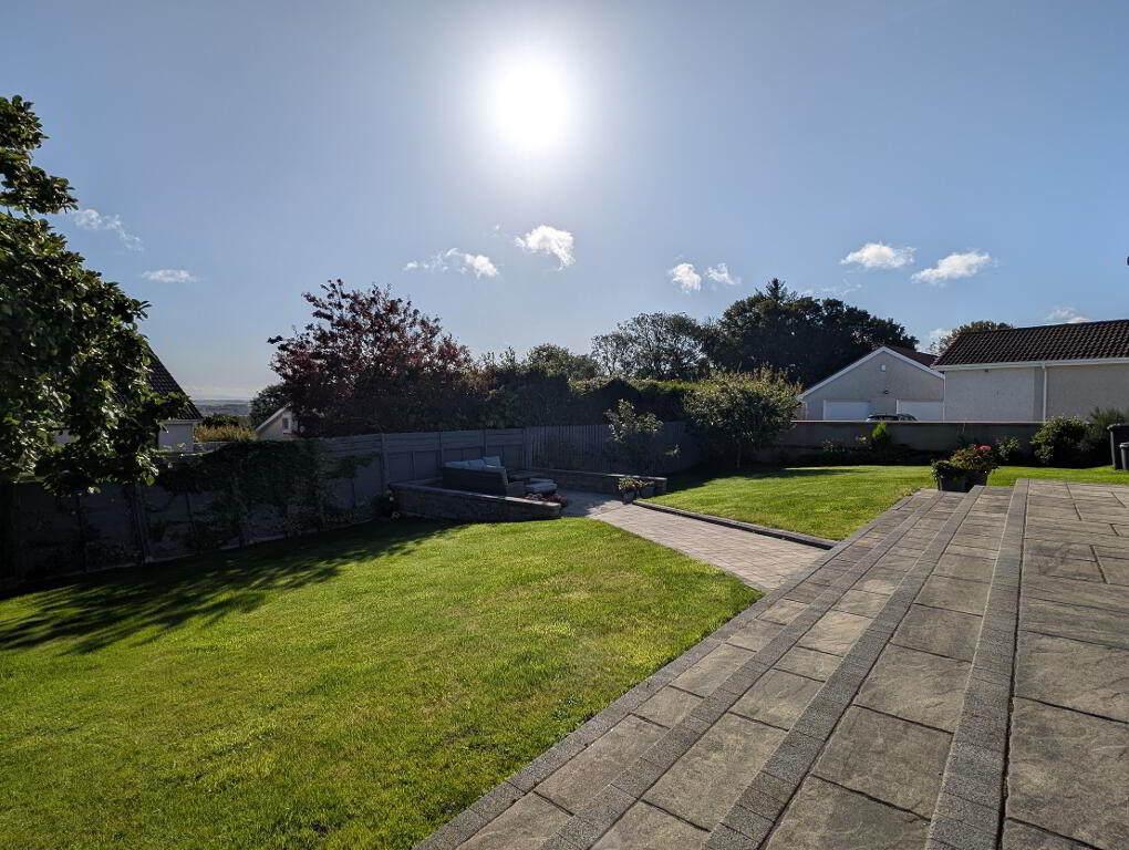 Generous wall and fence enclosed garden to rear with paved patio area on the upper level and steps down to the lower which is laid in lawn with mature shrub borders and paved BBQ area