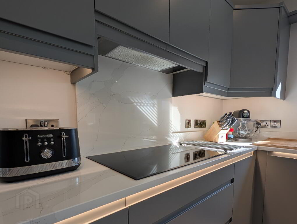 with Franke bowl and half stainless steel sink unit, range of eye and low level units, concealed lighting, pull-out bin, storage/larder unit, saucepan drawers, pelmet with downlighters, Quartz work top, upstand and splashback, AEG induction hob, twin Neff single ovens, extractor, integrated larder style fridge and dishwasher, recessed lights and tiled floor. Open Plan to: