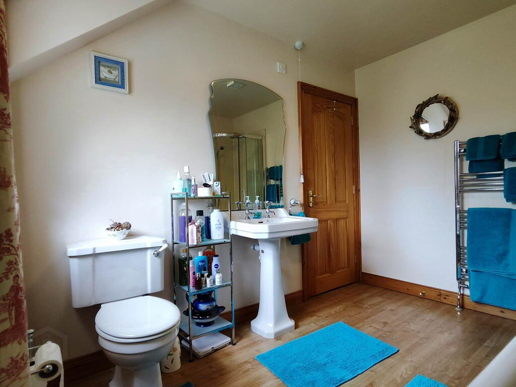 with wash hand basin, free standing Bath on claw feet, telephone hand shower, Pod style walk-in shower cubicle, Grohe mains shower fitting with telephone hand and raindrop shower heads, extractor fan, laminated wooden flooring